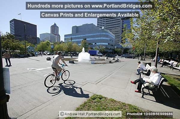Salmon Street Fountain, Cyclist, Fall Leaves, Tom McCall Waterfront Park