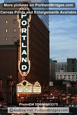 Schnitzer Portland Sign at Night, Broadway, Heathman Hotel