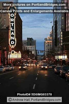 Schnitzer Portland Sign at Night, Broadway, Heathman Hotel