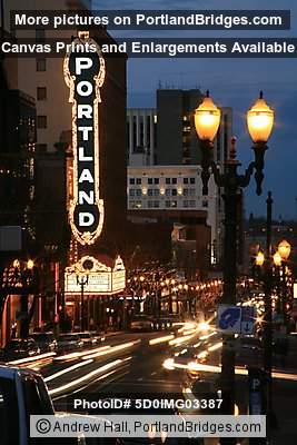 Schnitzer Portland Sign at Night, Broadway, Heathman Hotel