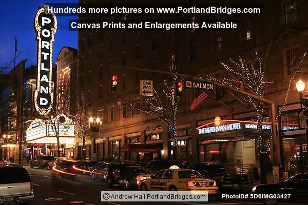 Schnitzer Portland Sign at Night, Broadway, Heathman Hotel