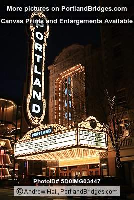 Schnitzer Portland Sign at Night, Broadway, Heathman Hotel