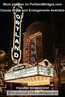 Schnitzer Portland Sign at Night, Broadway, Heathman Hotel