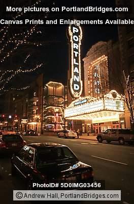 Schnitzer Portland Sign at Night, Broadway, Heathman Hotel
