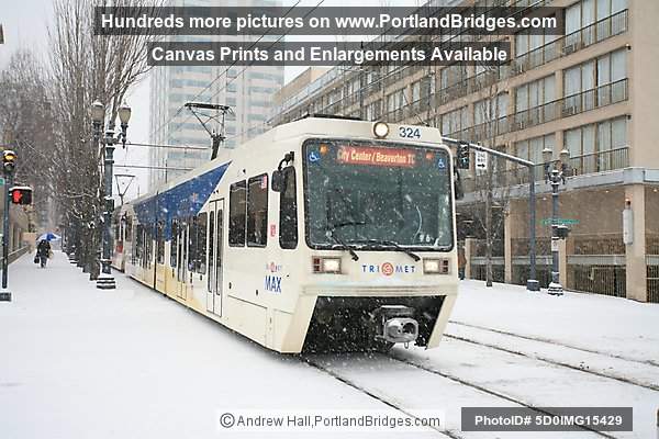 MAX Train in Snow, Rose Quarter, Steel Bridge