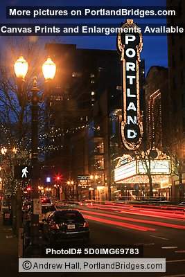 Schnitzer Portland Sign at Night, Broadway, Heathman Hotel