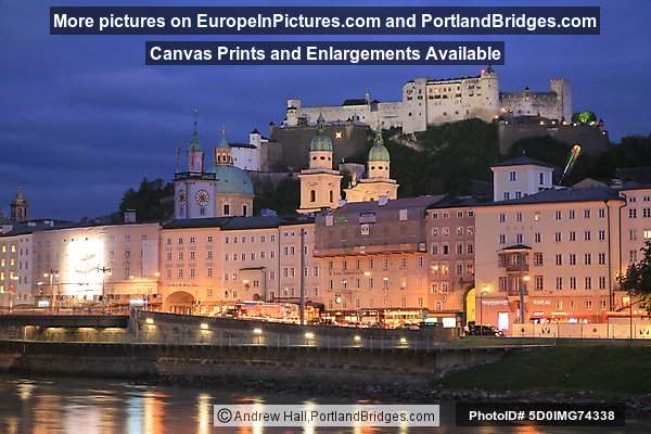 Salzburg, Austria Old Town, River, Hohensalzburg Fortress, Dusk