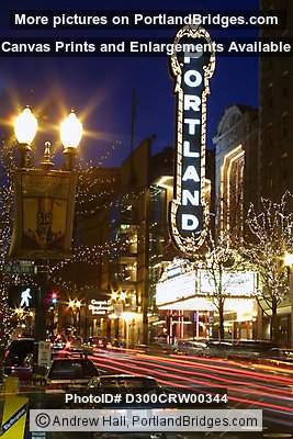 Schnitzer Portland Sign at Night, Broadway, Heathman Hotel