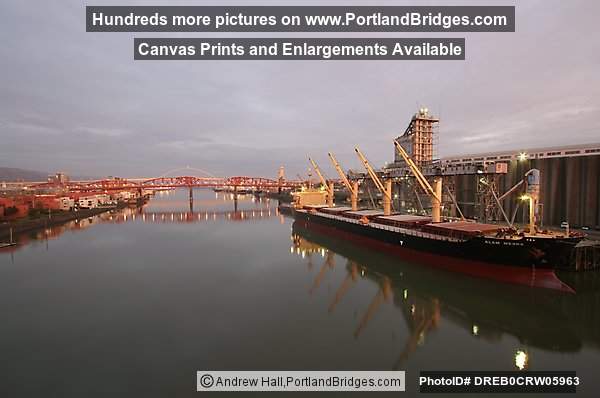 Grain Ship, Broadway Bridge, Willamette River Reflection, Morning