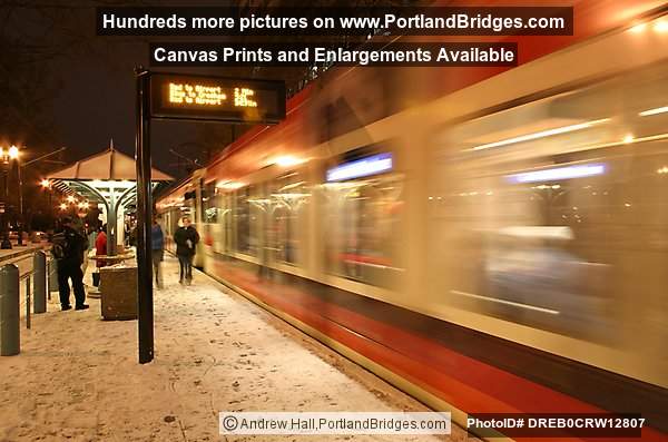 MAX Train Whizzing by, Lloyd Center, in the Snow, Night