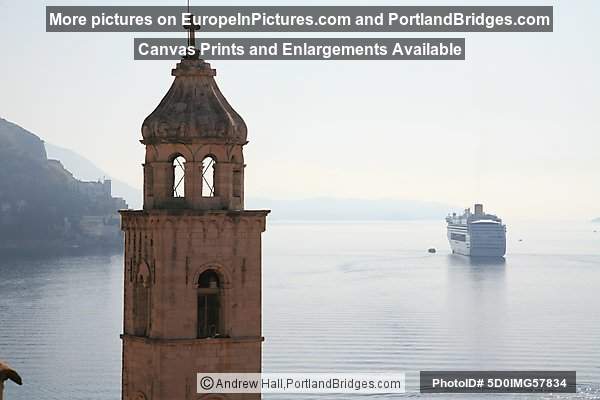 Walking the City Walls, Dubrovnik, Croatia: Bell Tower and Cruise Ship