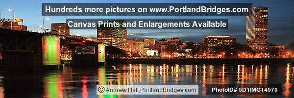 Portland, Oregon Cityscape, Reflections, Morrison Bridge, Lit, Dusk (3)