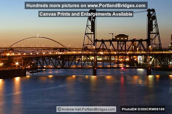 Steel Bridge and Fremont Bridge, Dusk, Willamette River