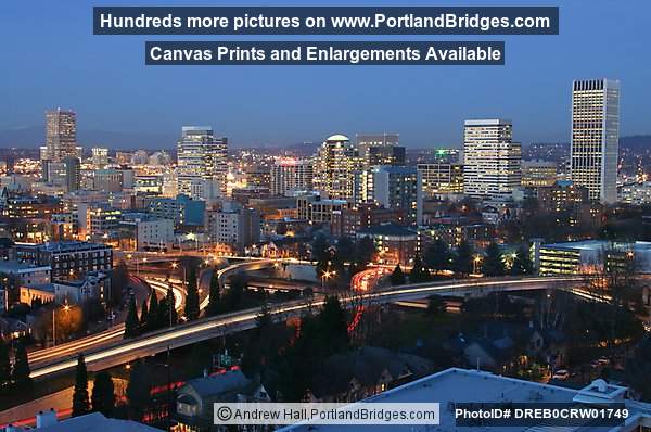 Portland, Oregon Cityscape, Reflections, Morrison Bridge, Freeway LIghts, Dusk