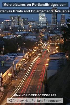 Portland, Oregon Cityscape, Reflections, Morrison Bridge, Freeway LIghts, Dusk