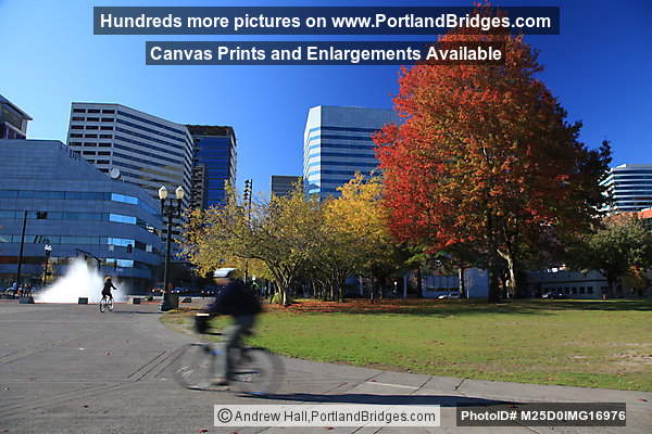 Salmon Street Fountain, Cyclist, Fall Leaves, Tom McCall Waterfront Park